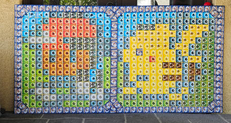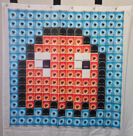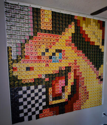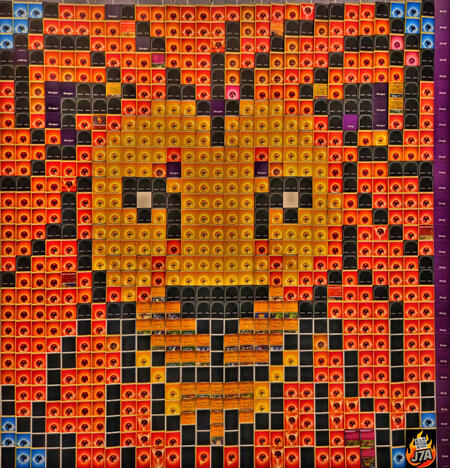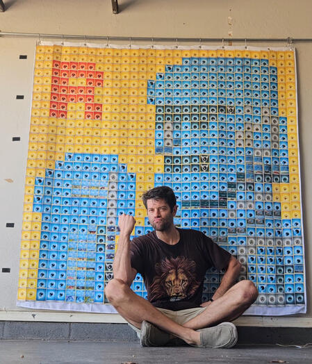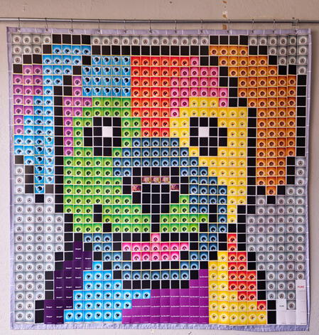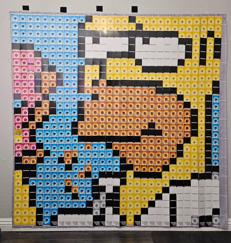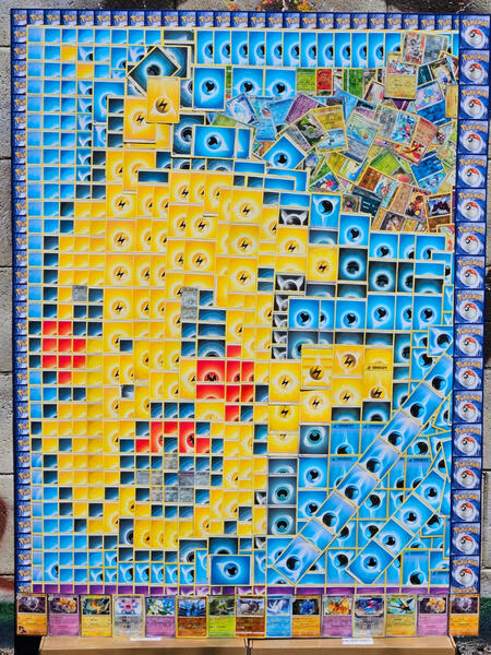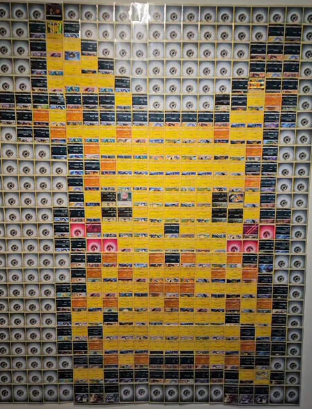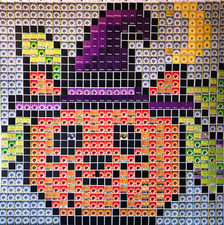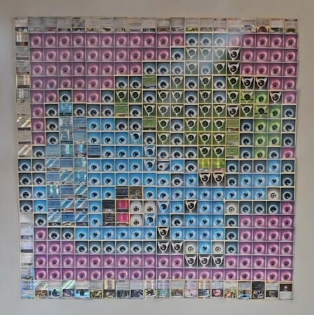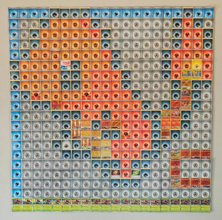 The Pixel Cardist is a mixed-media sculpturist who transforms recycled trading cards into large-scale modular mosaics — physical pixels that build living, functional art.